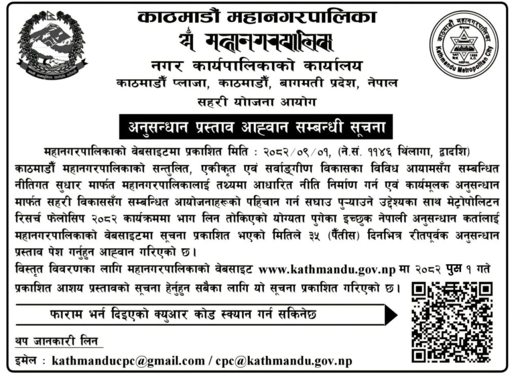 - मेट्रोपोलिटन रिसर्च फेलोसिप कार्यक्रम २०८२ को लागि अनुसन्धान प्रस्ताव आव्हान सम्बन्धी सूचना। प्रकाशित मिति : 2025/12/16 16:12:04