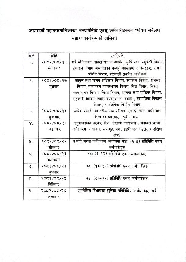 - उपस्थिति सम्बन्धमा। (श्री सबै विभाग/सचिवालय/आयोजना/कार्यक्रम, काठमाडौँ महानगरपालिका)प्रकाशित मिति : 2025/11/30 13:54