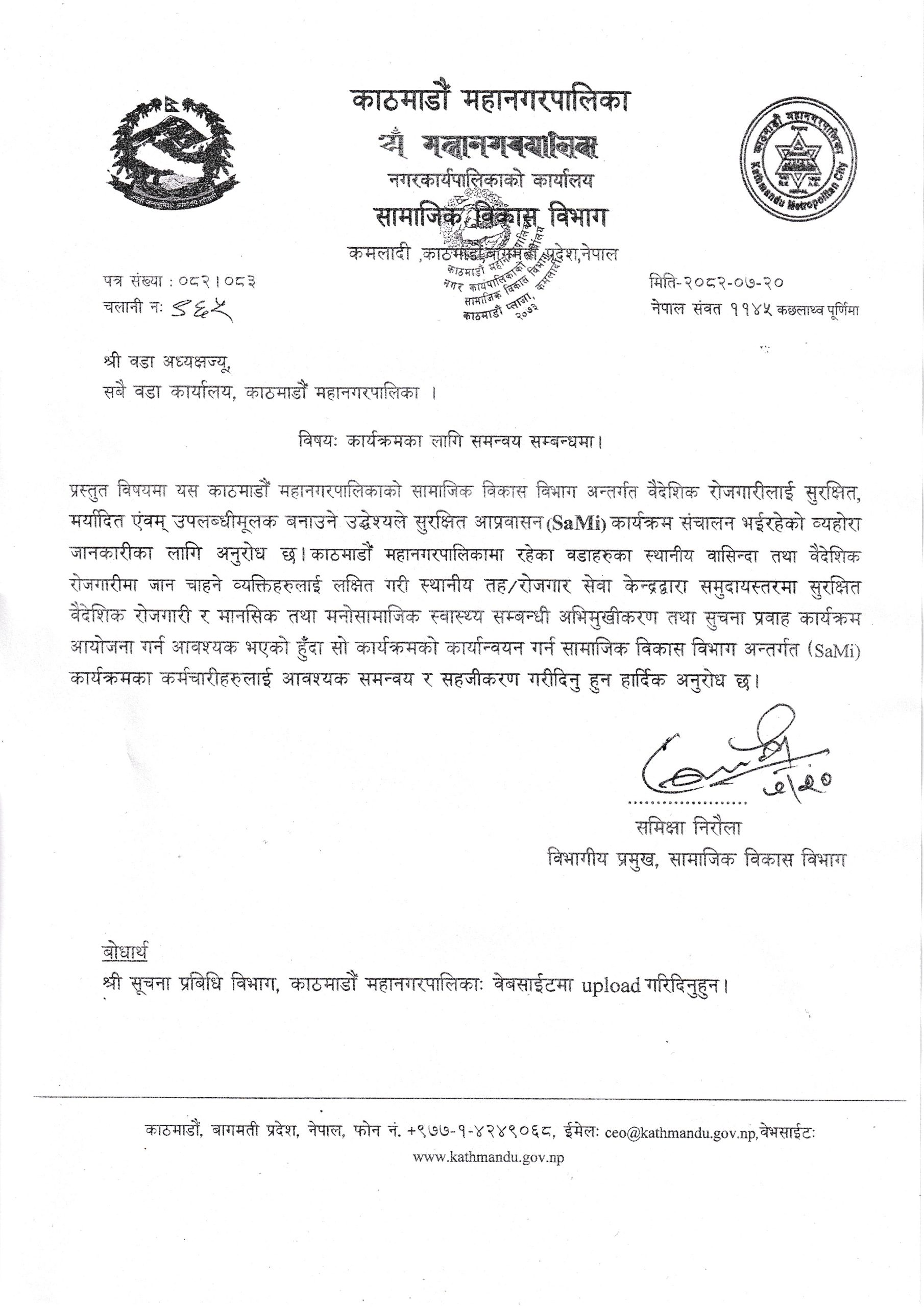 आप्रवासन (SaMi) कार्यक्रमका लागि समन्वय सम्बन्धमा। (श्री वडा अध्यक्षज्यू, सबै वडा कार्यालय, का.म.पा)
