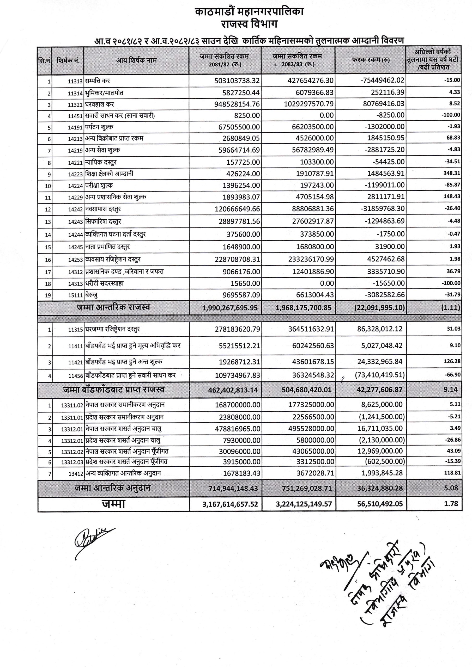 आ.व. २०८१/८२ र आ.व. २०८२/८३ साउन देखि कार्तिक महिनासम्मको तुलनात्मक आम्दानी विवरण।
