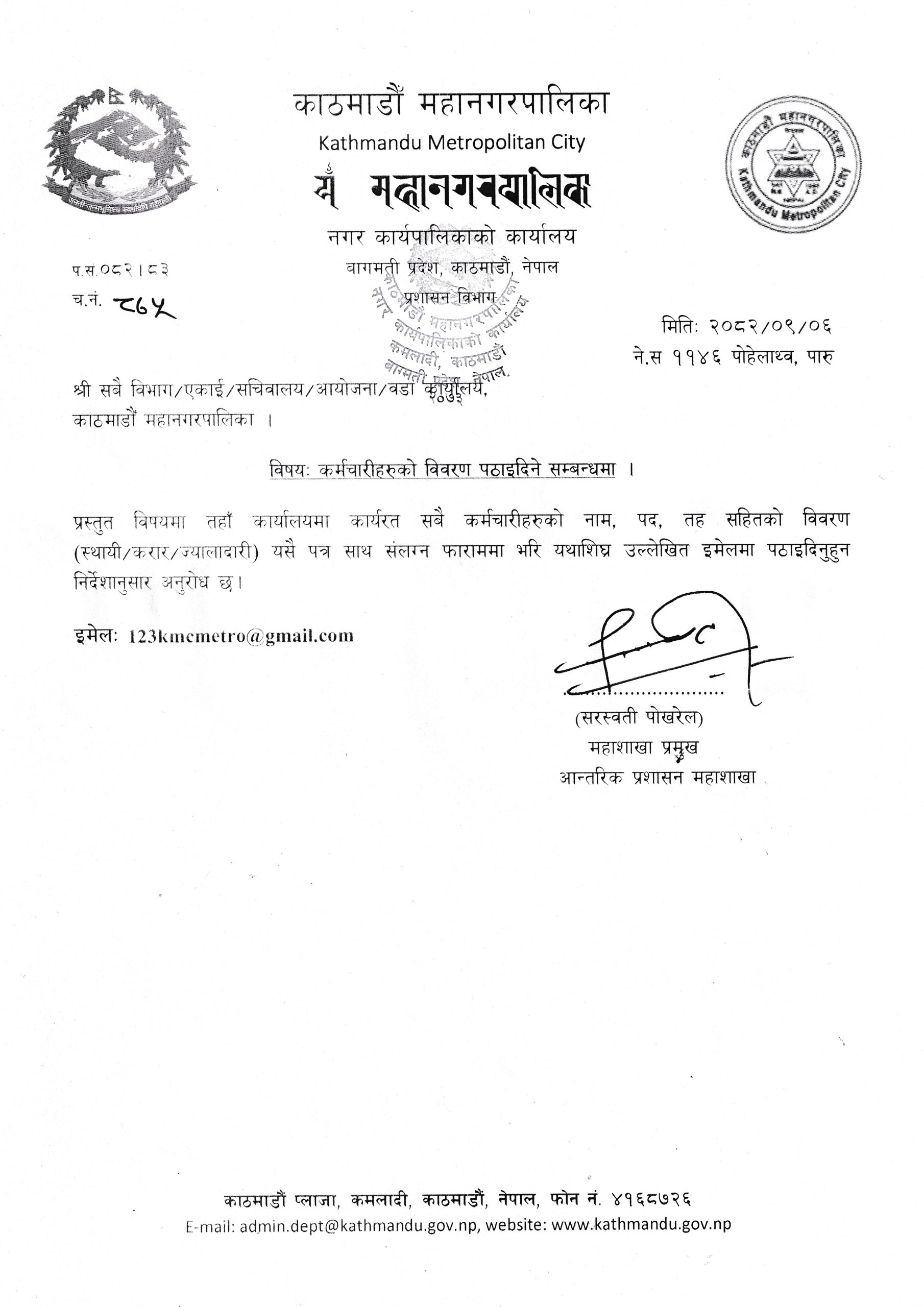 कर्मचारीहरूको विवरण पठाइदिने सम्बन्धमा। (श्री सबै विभाग/सचिवालय/एकाई/आयोजना/सबै वडा कार्यालयहरु, काठमाडौँ महानगरपालिका )