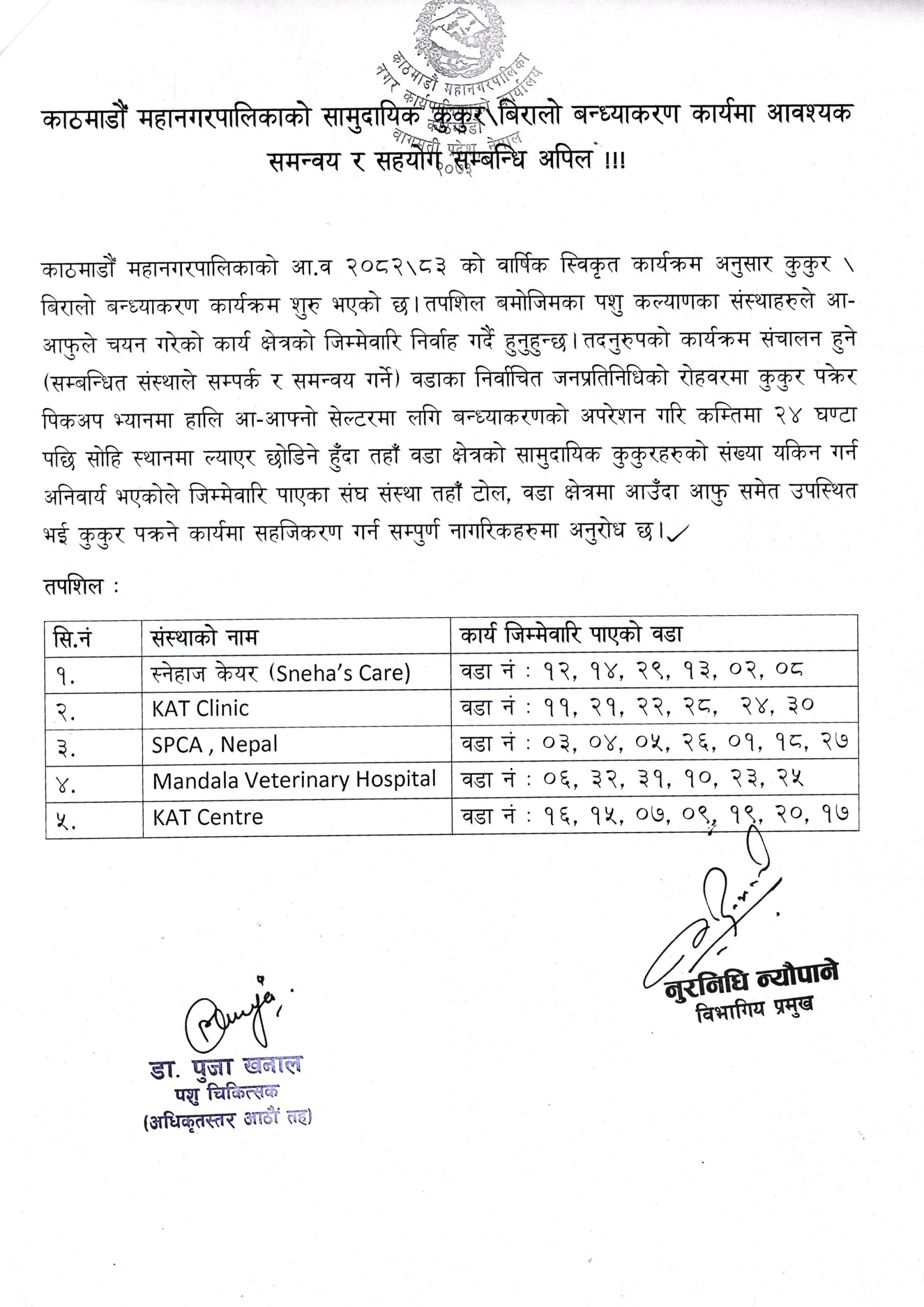 काठमाडौँ महानगरपालिकाको सामुदायिक कुकुर/बिरालो बन्ध्याकरण कार्यमा आवश्यक समन्वय र सहयोग सम्बन्धि अपिल !!!