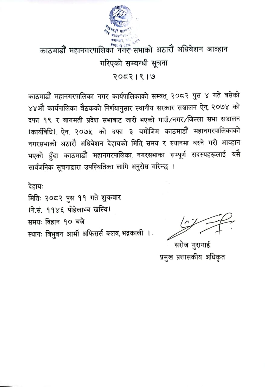 काठमाडौँ महानगरपालिका नगर सभाको अठारौं अधिवेशन आव्हान गरिएको सम्बन्धी सूचना ।