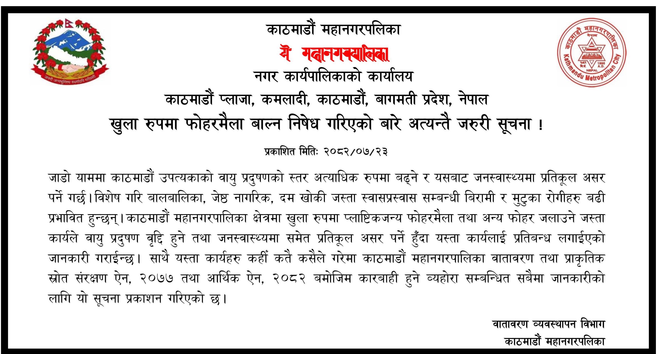 खुल्ला रुपमा फोहरमैला बाल्न निषेध गरिएको बारे अत्यन्तै जरुरी सूचना !