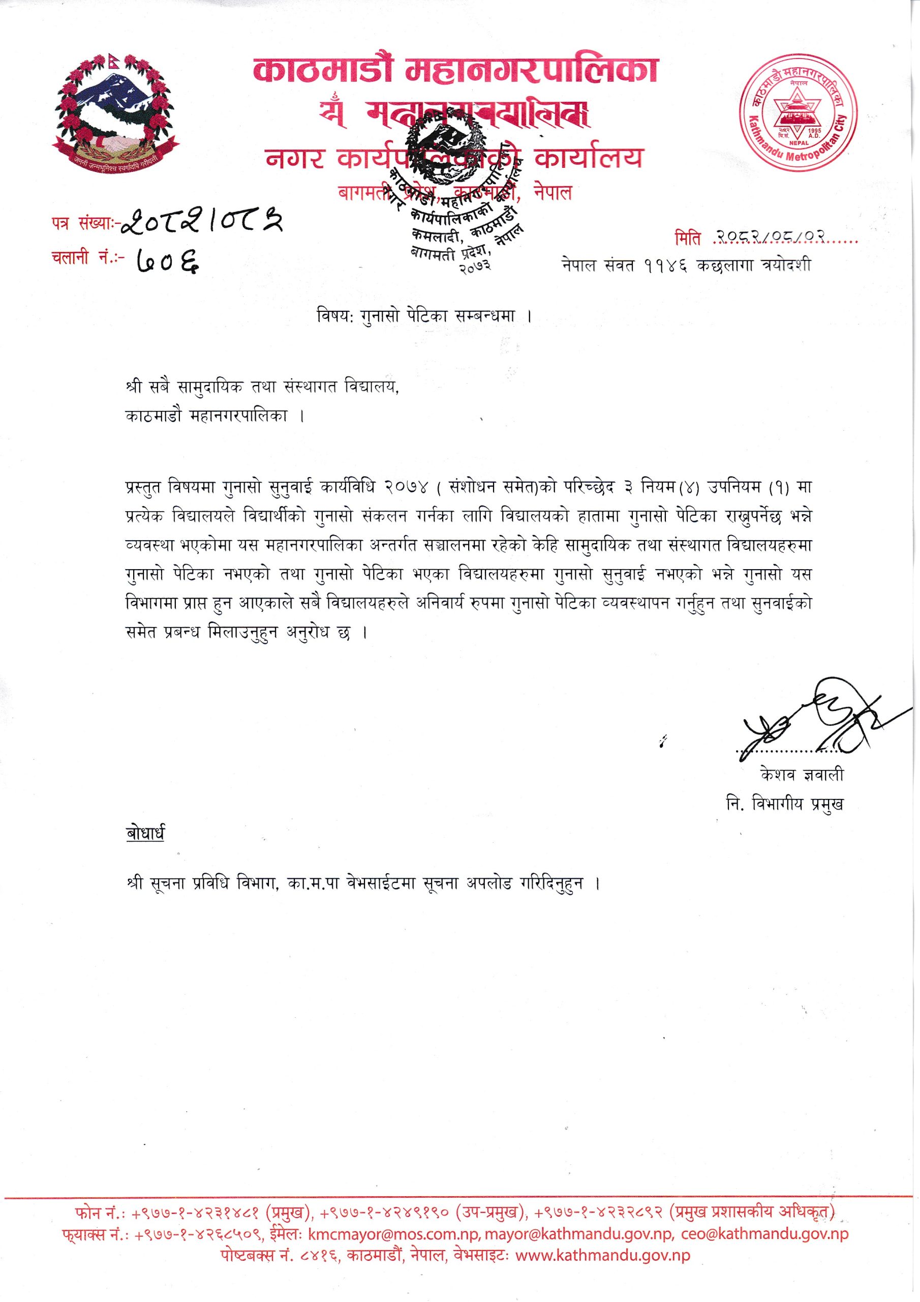 गुनासो पेटिका सम्बन्धमा। (श्री सबै सामुदायिक तथा संस्थागत विद्यालय, काठमाडौँ महानगरपालिका)