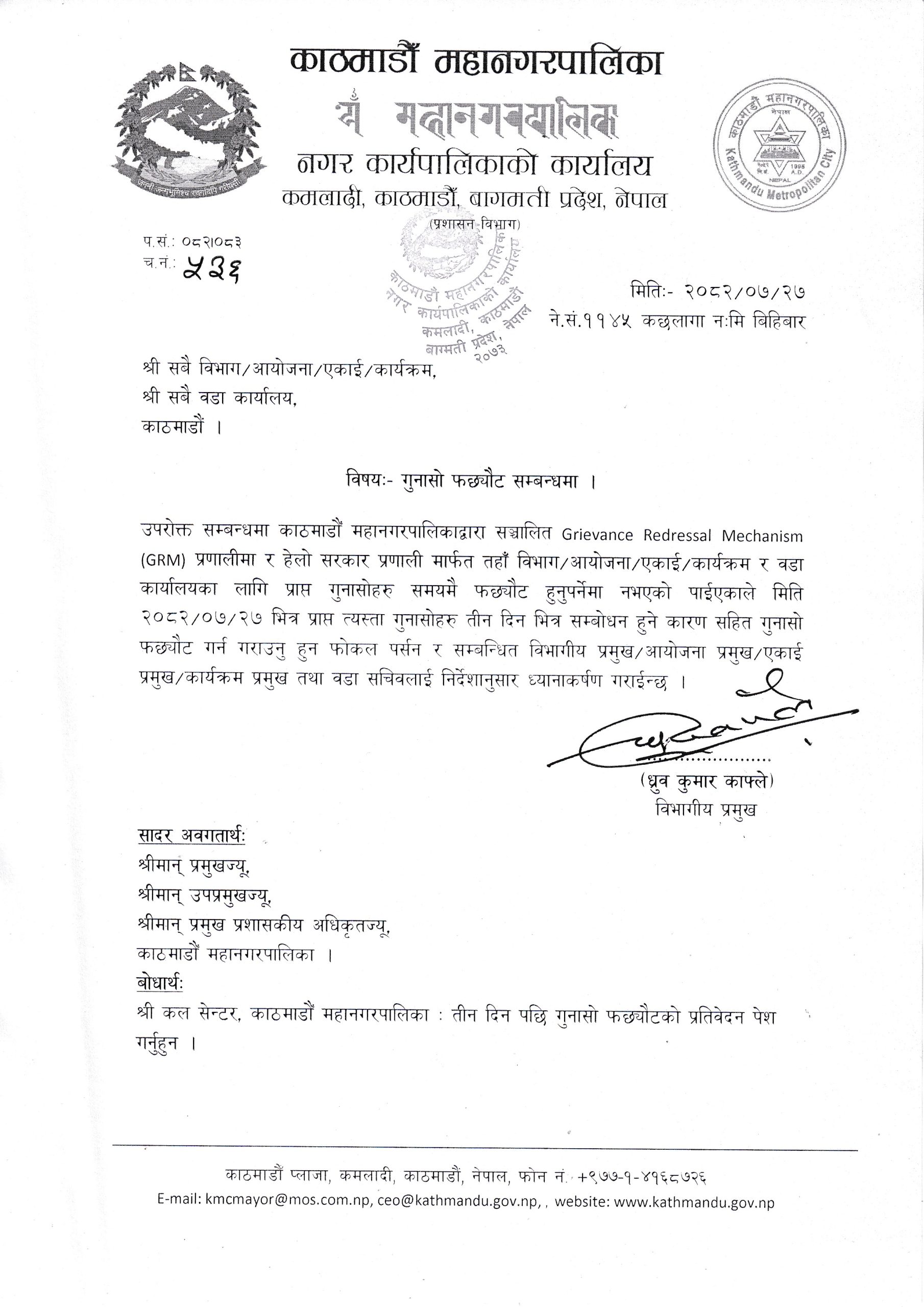 गुनासो फर्छ्यौट सम्बन्धमा। (श्री सबै विभाग/आयोजना/एकाई/कार्यक्रम, सबै वडा कार्यालय, काठमाडौँ महानगरपालिका )