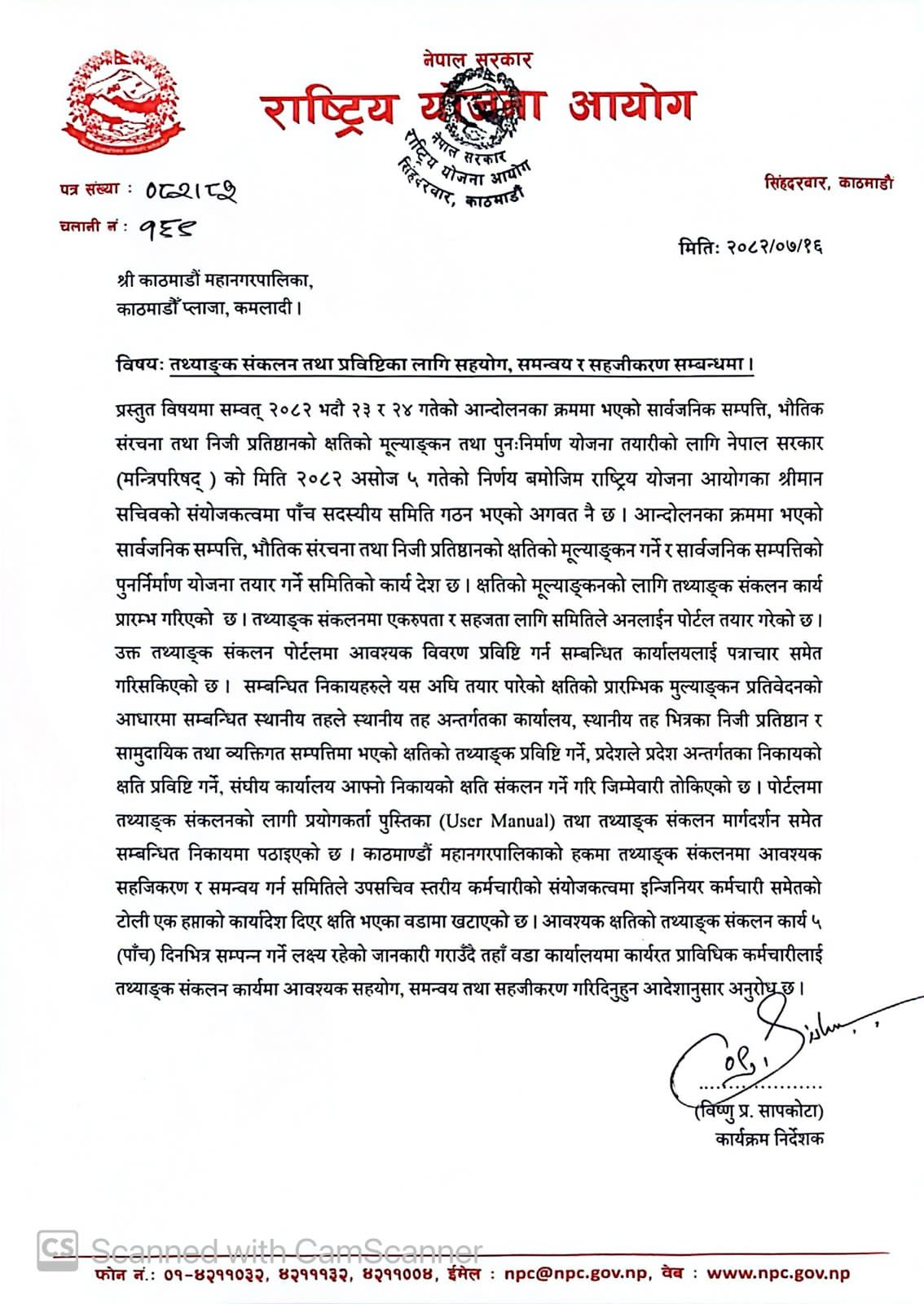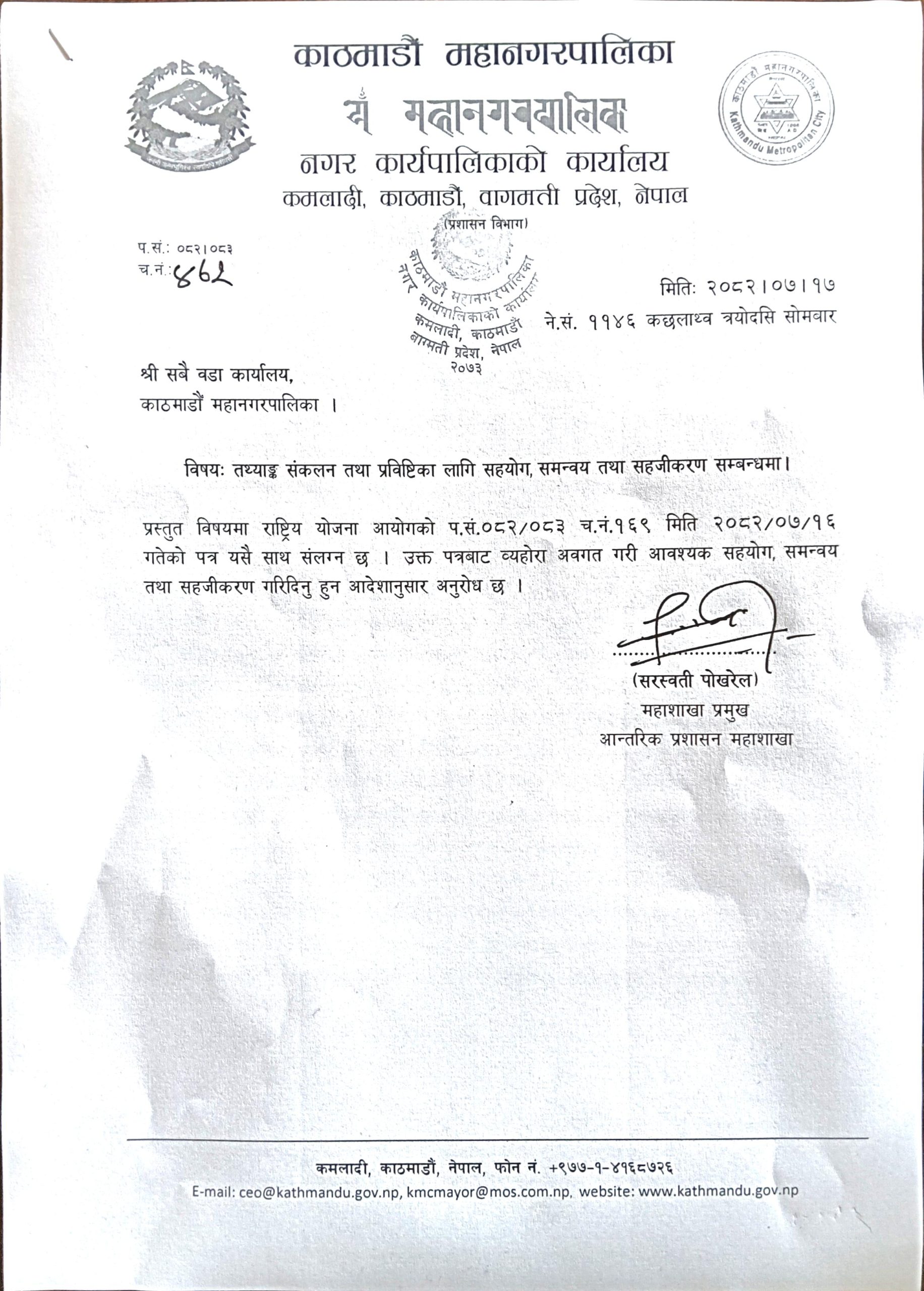 तथ्याङ्क संकलन तथा प्रविष्टिका लागि सहयोग,समन्वय तथा सहजीकरण सम्बन्धमा। (श्री सबै वडा कार्यालय, काठमाडौँ महानगापालिका।)