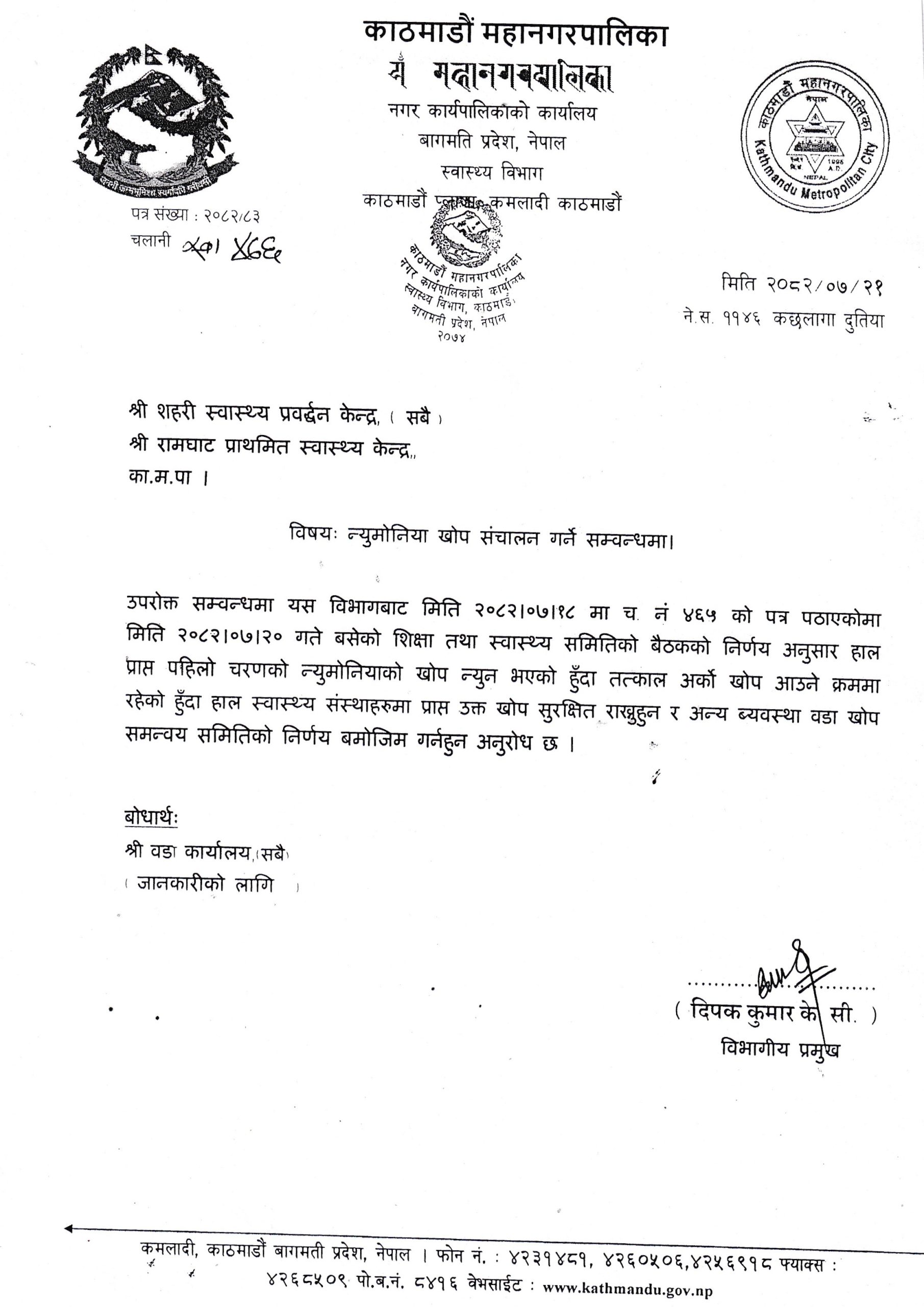 न्युमोनिया खोप संचालन गर्ने सम्बन्धमा। (श्री सबै शहरी स्वास्थ्य प्रवर्द्धन केन्द्र, रामघाट प्राथमिक स्वास्थ्य केन्द्र, का.म.पा.