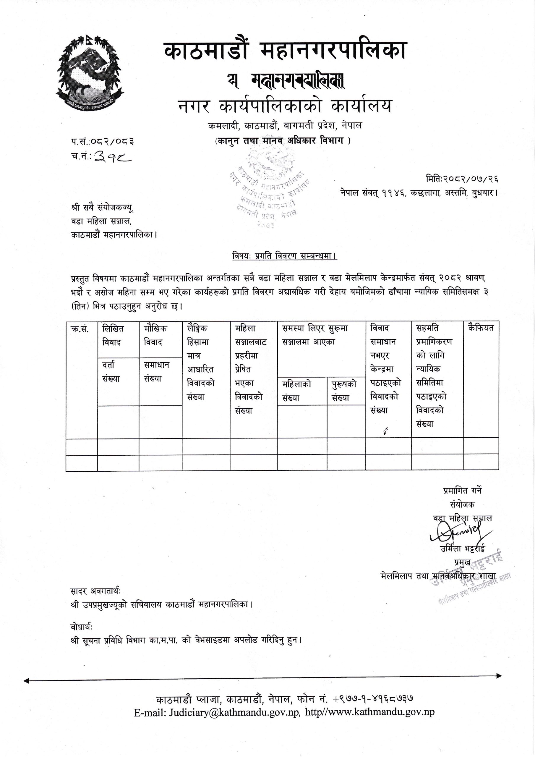 प्रगति विवरण पठाइदिने सम्बन्धमा। (श्री सबै विभाग/सचिवालय/एकाइ/आयोजना/कार्यक्रम, सबै वडा कार्यालय, काठमाडौँ महानगरपालिका।)