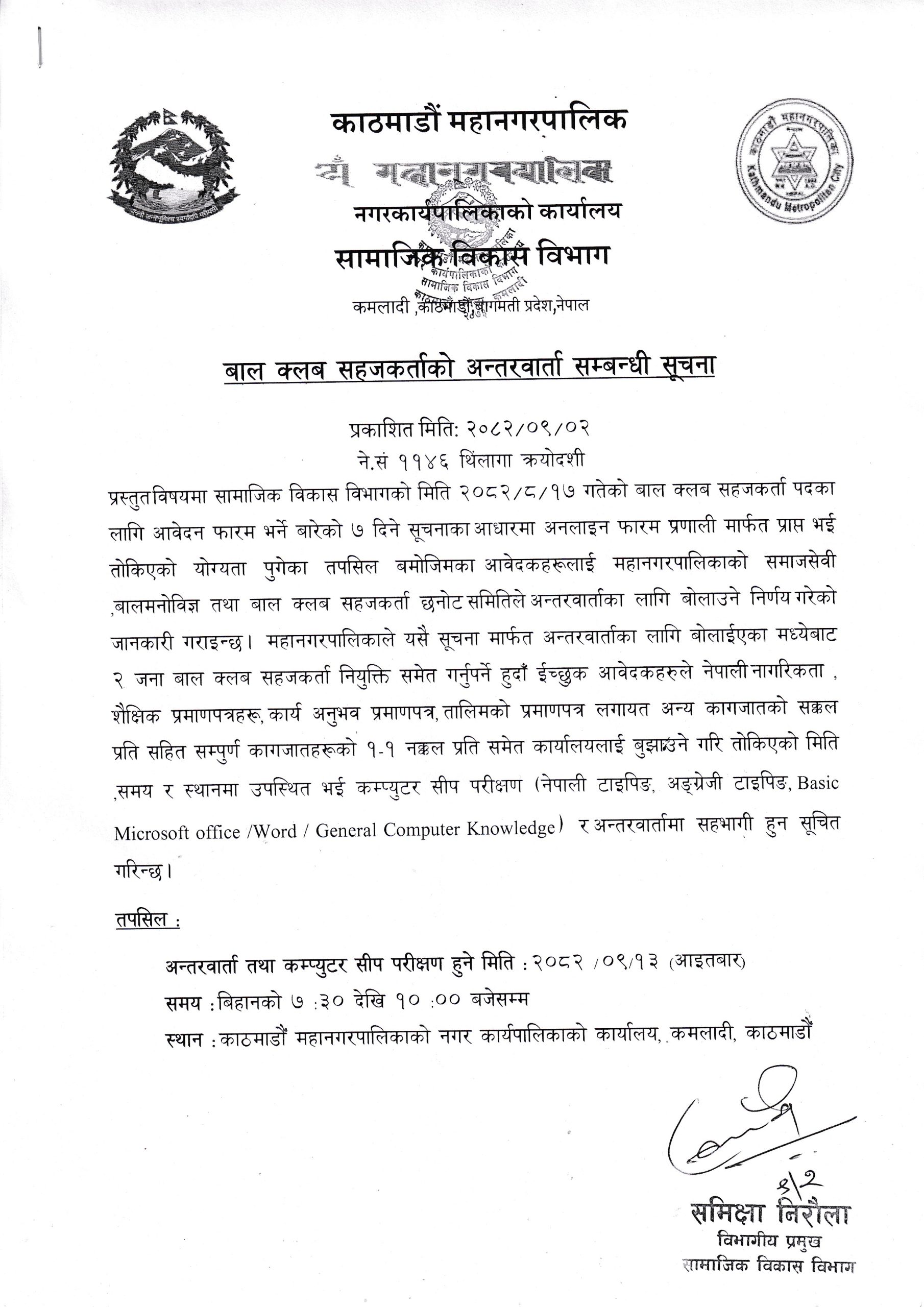 बाल क्लब सहजकर्ताको अन्तरवार्ता सम्बन्धी सूचना।
