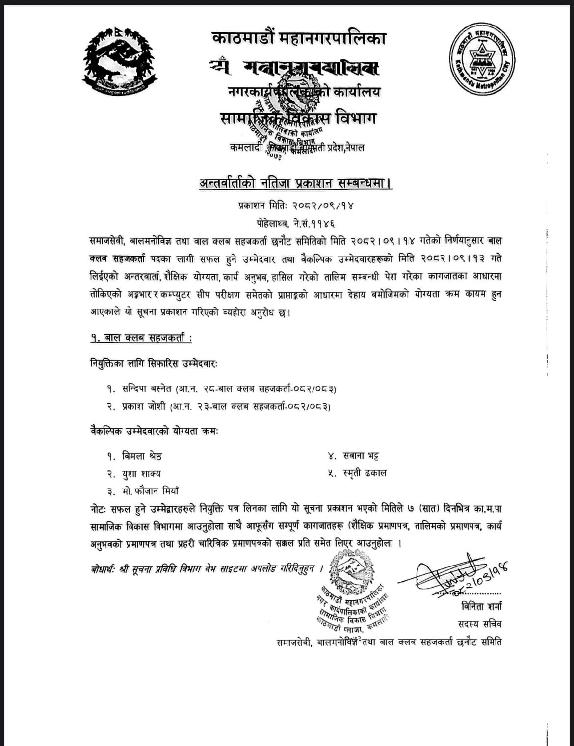 बाल क्लब सहजकर्ता पदको अन्तर्वार्ताको नतिजा प्रकाशन सम्बन्धमा।