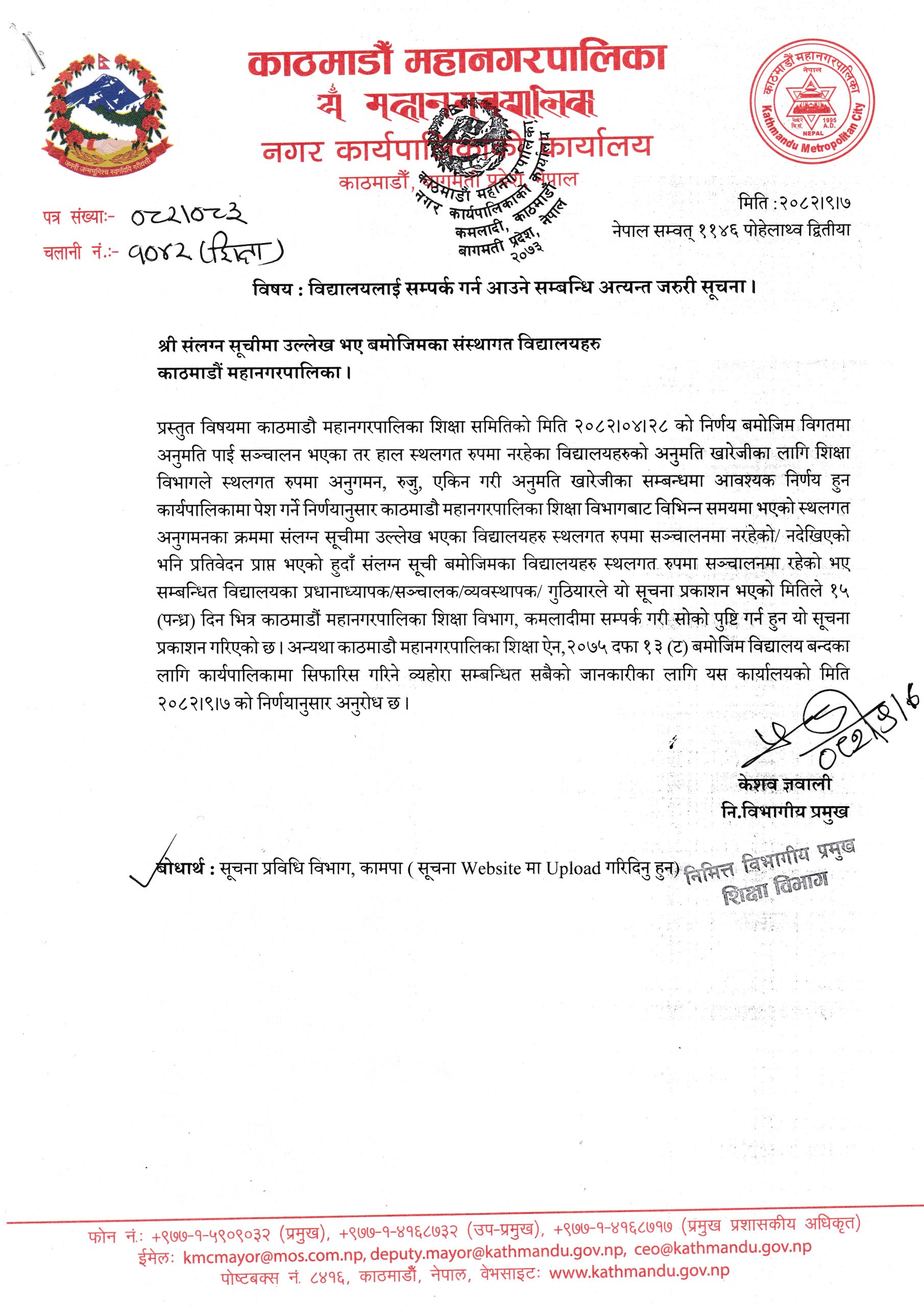 विद्यालयलाई सम्पर्क गर्न आउने सम्बन्धी अत्यन्त जरूरी सूचना।