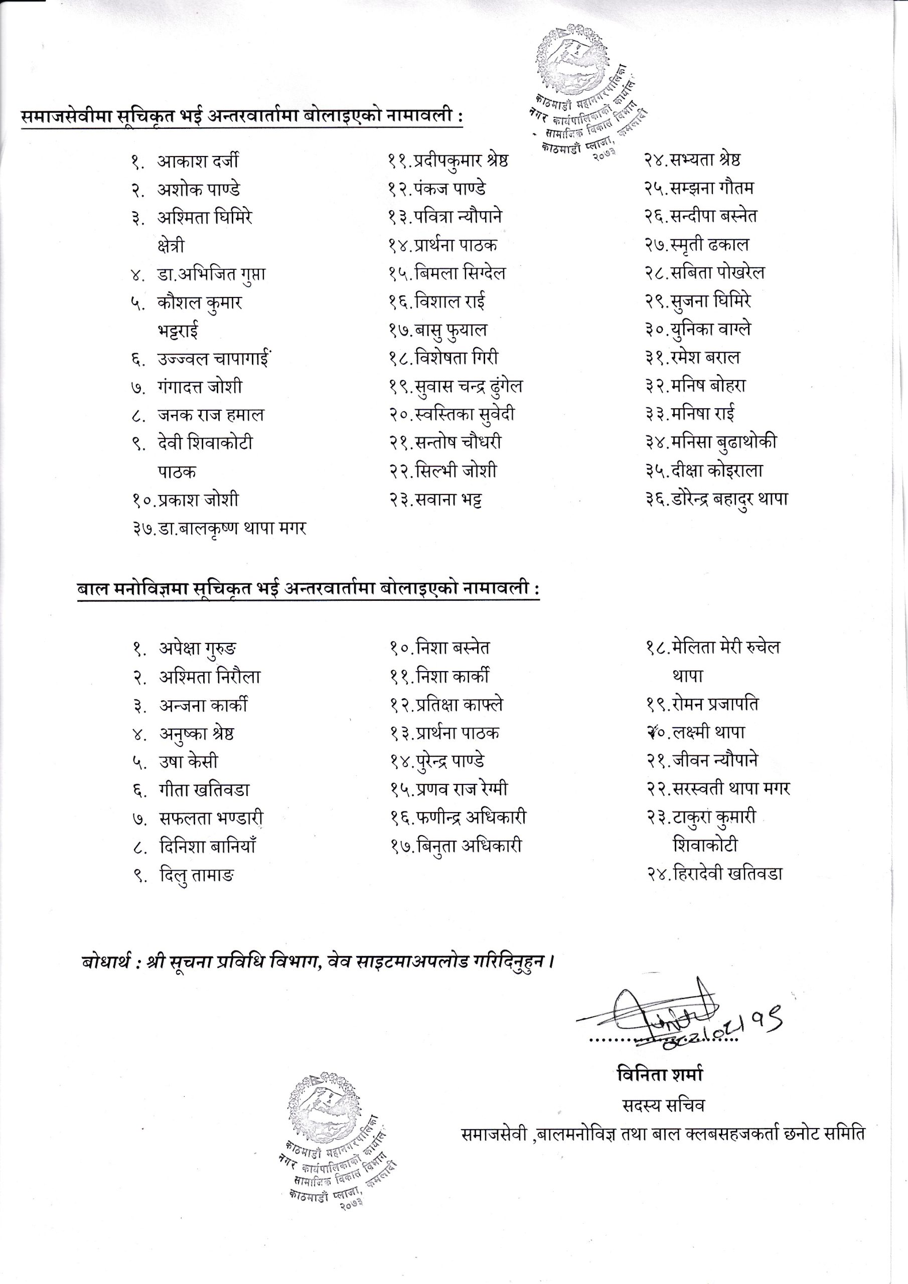 समाजसेवी तथा बाल मनोविज्ञ सूचिकृत गरिएको र अन्तरवार्ता सम्बन्धी सूचना।