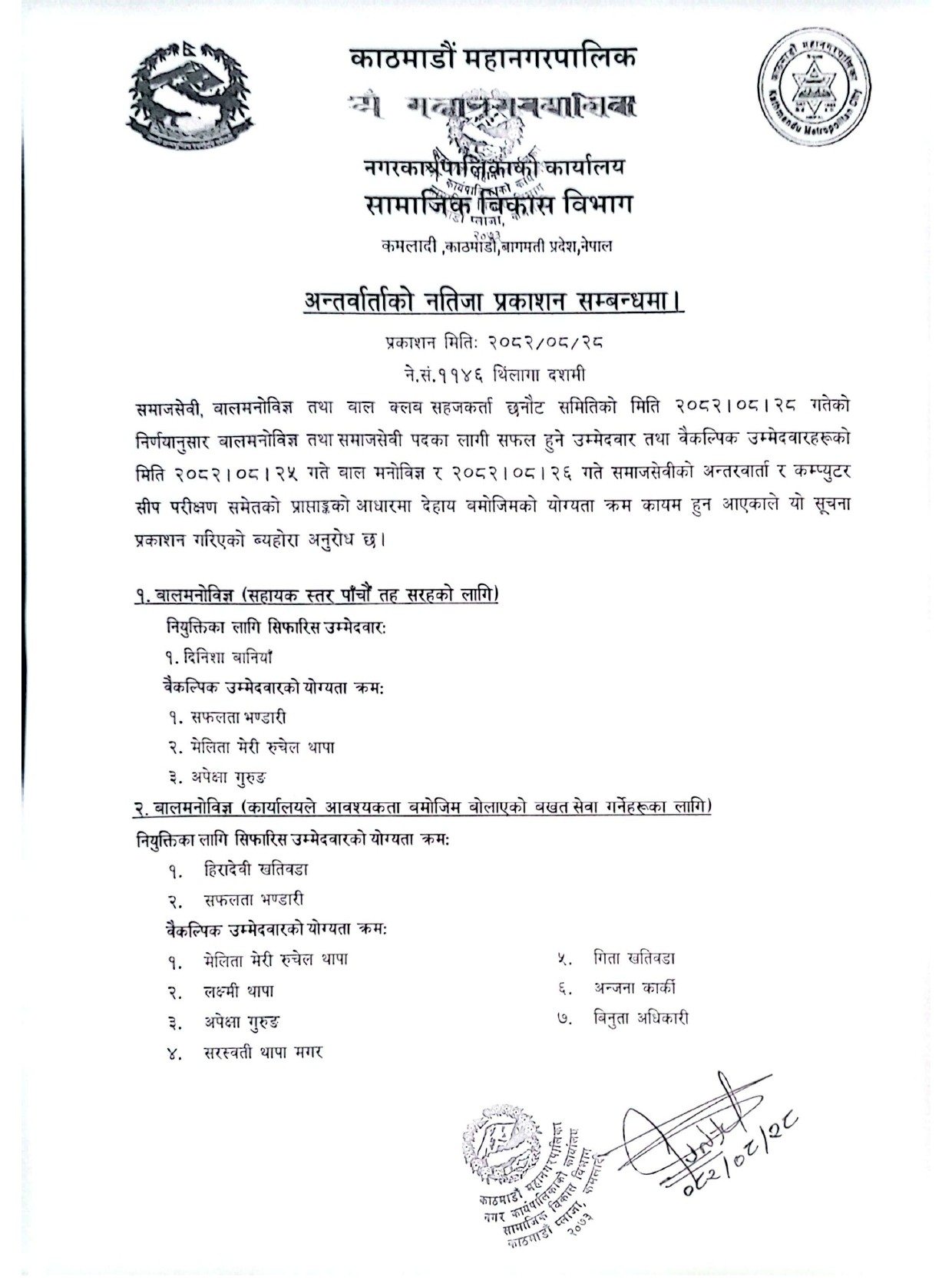 समाजसेवी र बालमनोविज्ञको नतिजा प्रकाशन गरिएको बारे सूचना।