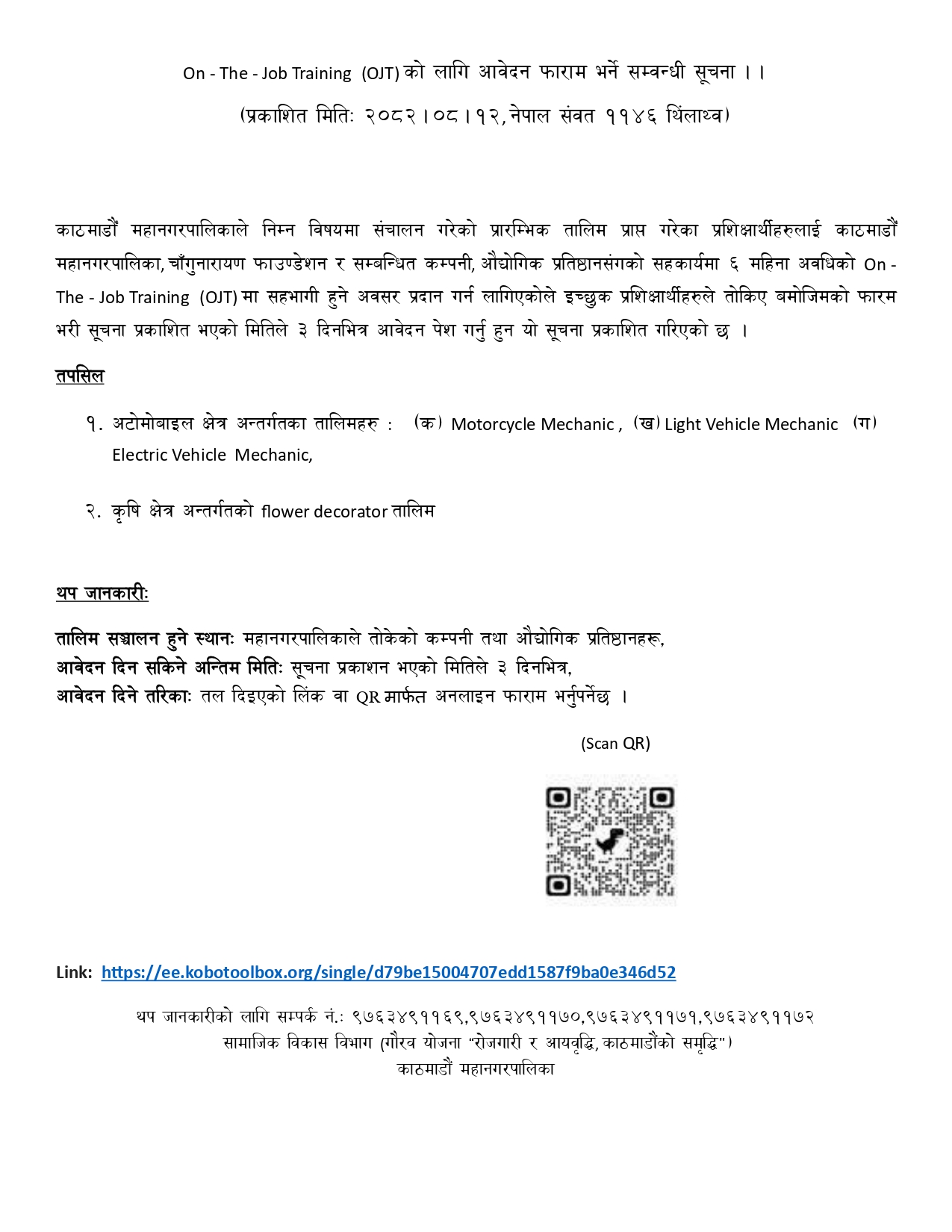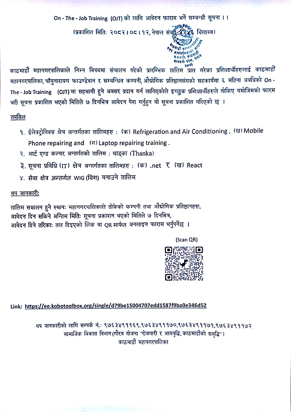 On – The – Job Training (OJT) को लागि आवेदन फारम भर्ने सम्वन्धी सूचना ।