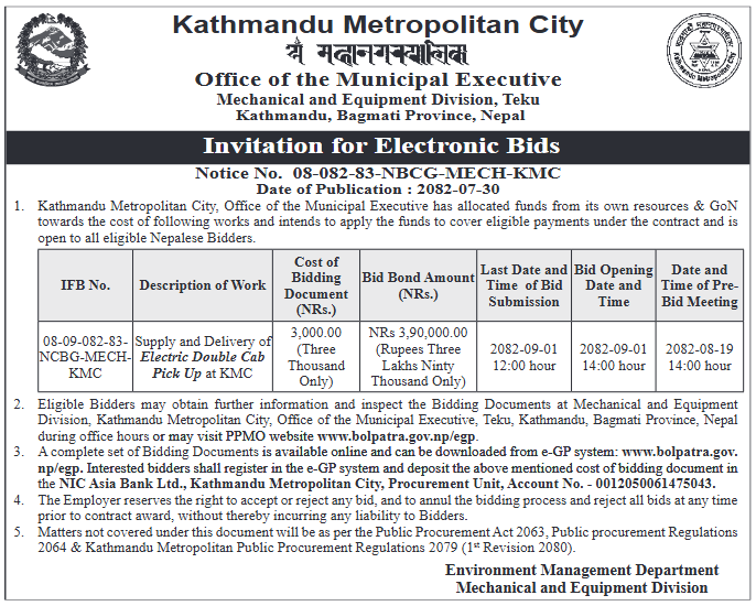 Invitation for Electronic Bids (Supply and Delivery of Electric Double Cab Pick Up at KMC)